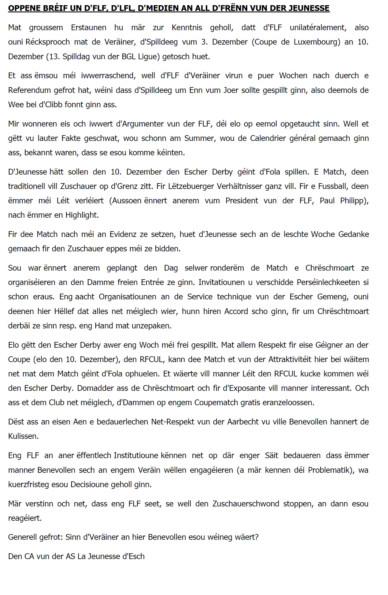 Vous trouvez en annexe une lettre ouverte de notre part (en luxembourgeois) avec plus de détails. Elle a été envoyée à la FLF, la LFL et aux médias. luxembourgeois.